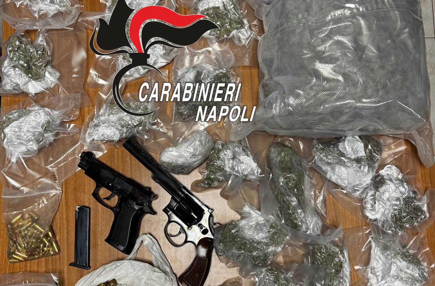 La luce è accesa ed il portone spalancato. I militari entrano ma l’androne è vuoto. Dietro le scale c’è una busta di un noto brand di lusso. Al suo interno non ci sono né borse né scarpe, come da immaginario collettivo, ma una pistola revolver calibro 38, una pistola semiautomatica modello 85 e 188 munizioni di vario calibro.