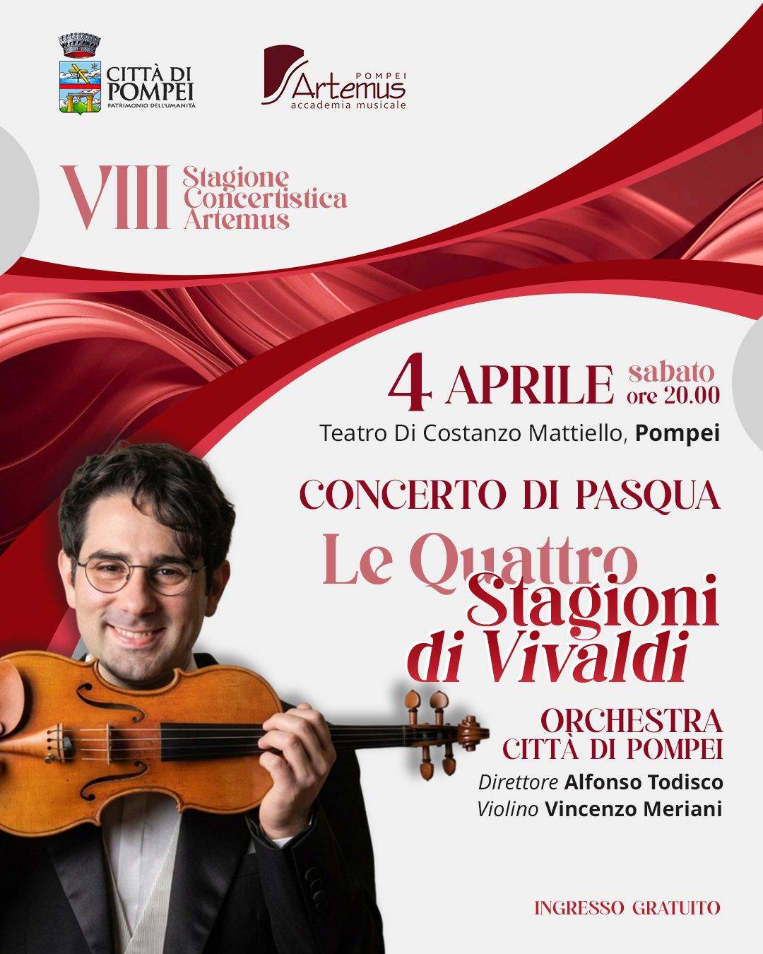 Con il concerto “Le quattro stagioni” di Vivaldi, in programma sabato 4 aprile 2026 alle ore 20 al teatro “Di Costanzo Mattiello” di Pompei (ingresso gratuito), entra nel vivo l’ottava Stagione Concertistica Artemus, giunta al suo terzo appuntamento.