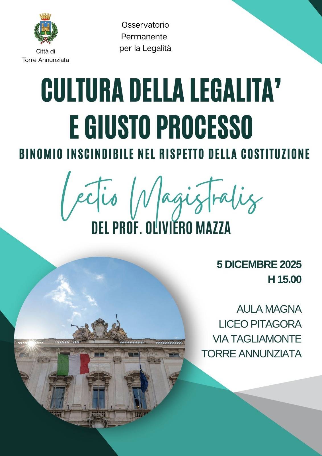Si terrà venerdì 5 dicembre alle ore 15.00 presso l’Aula Magna del Liceo Pitagora di Torre Annunziata il convegno dal titolo “Cultura della Legalità e giusto processo. Binomio inscindibile nel rispetto della Costituzione”.