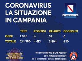 Bollettino coronavirus in Campania: 4 nuovi positivi e 34 guariti