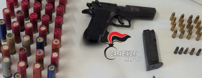 I militari trovano una pistola automatica calibro 9×21 perfettamente funzionante e ben 75 proiettili di diverso calibro (19 colpi px19, 51 colpi calibro16, 3 colpi con calibro da accertare e 2 colpi cal. 32 s&w).