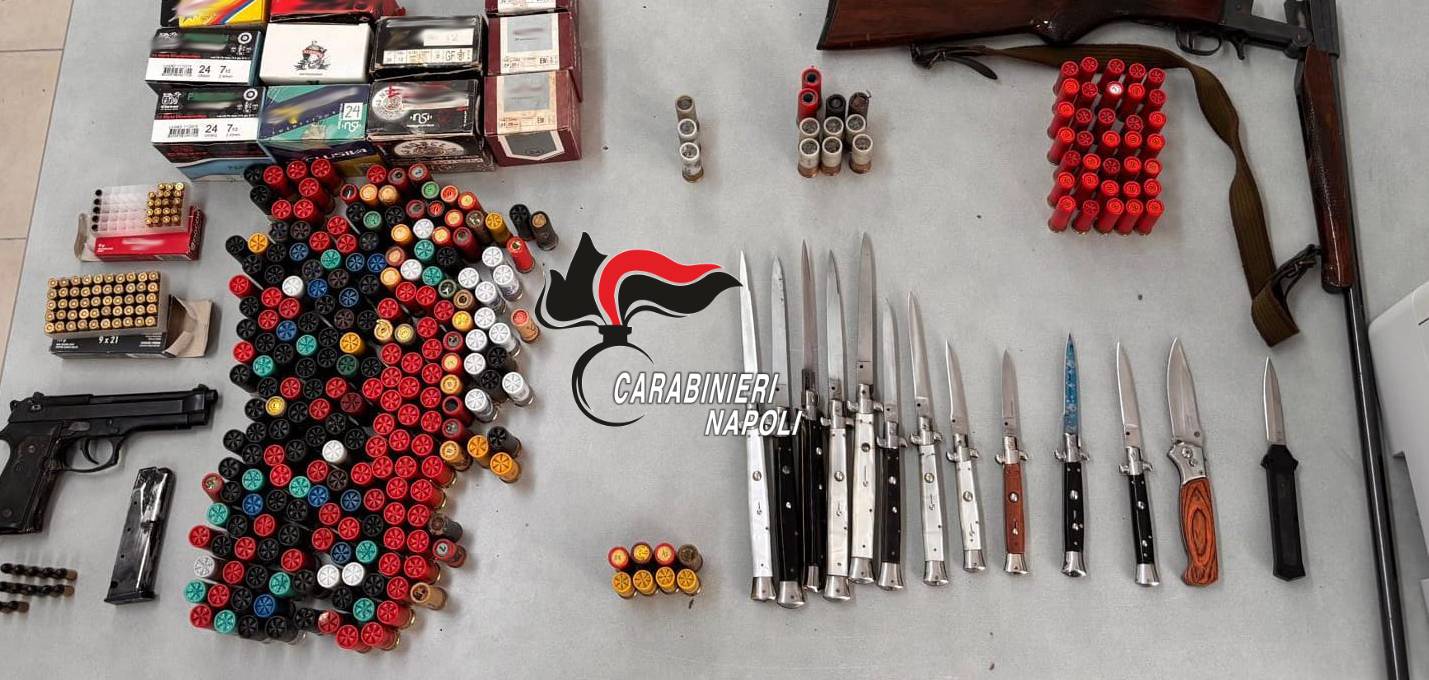 In casa, infatti, sono stati rinvenuti e sequestrati una pistola calibro 9×21 risultata rubata, un fucile calibro 24 di dubbia provenienza, 619 cartucce di diverso calibro e 13 coltelli a serramanico di varie dimensioni.
