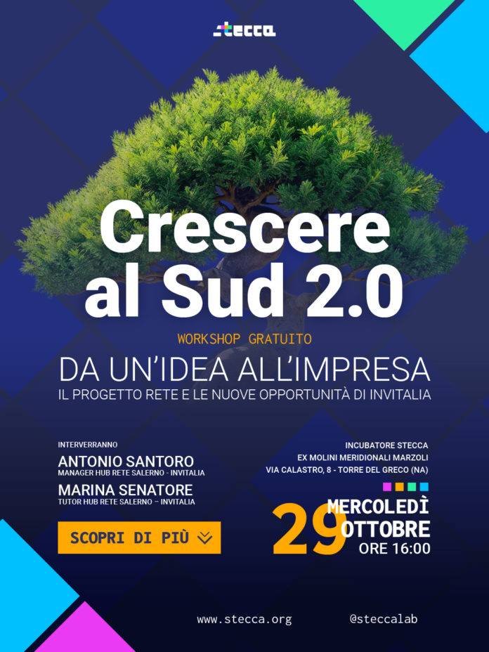 Si terrà mercoledì 29 ottobre, alle ore 16:00, presso STECCA, il workshop gratuito “Crescere al Sud 2.0 – Da un’idea all’impresa: Presentazione del Progetto Rete e delle misure di Invitalia”, un appuntamento dedicato a chi vuole sviluppare la propria idea imprenditoriale e conoscere da vicino le opportunità per fare impresa nel Mezzogiorno.
