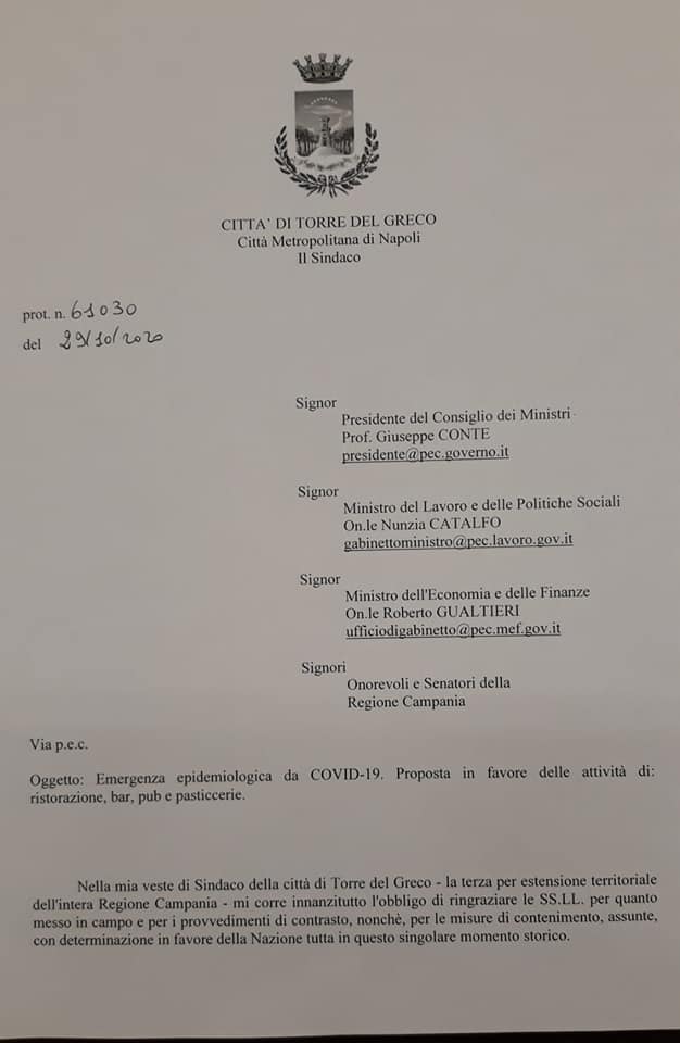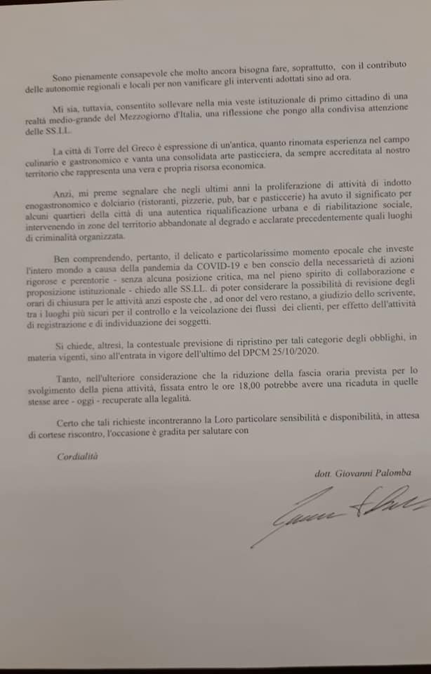 Il sindaco di Torre del Greco, Giovanni Palomba, ha firmato, questa mattina nei nostri studi, una lettera indirizzata al Presidente del Consiglio Conte ed ai ministri competenti. Nella missiva il primo cittadino manifesta i problemi che sta affrontando il settore della ristorazioni dopo le chiusure imposte dal DPCM.