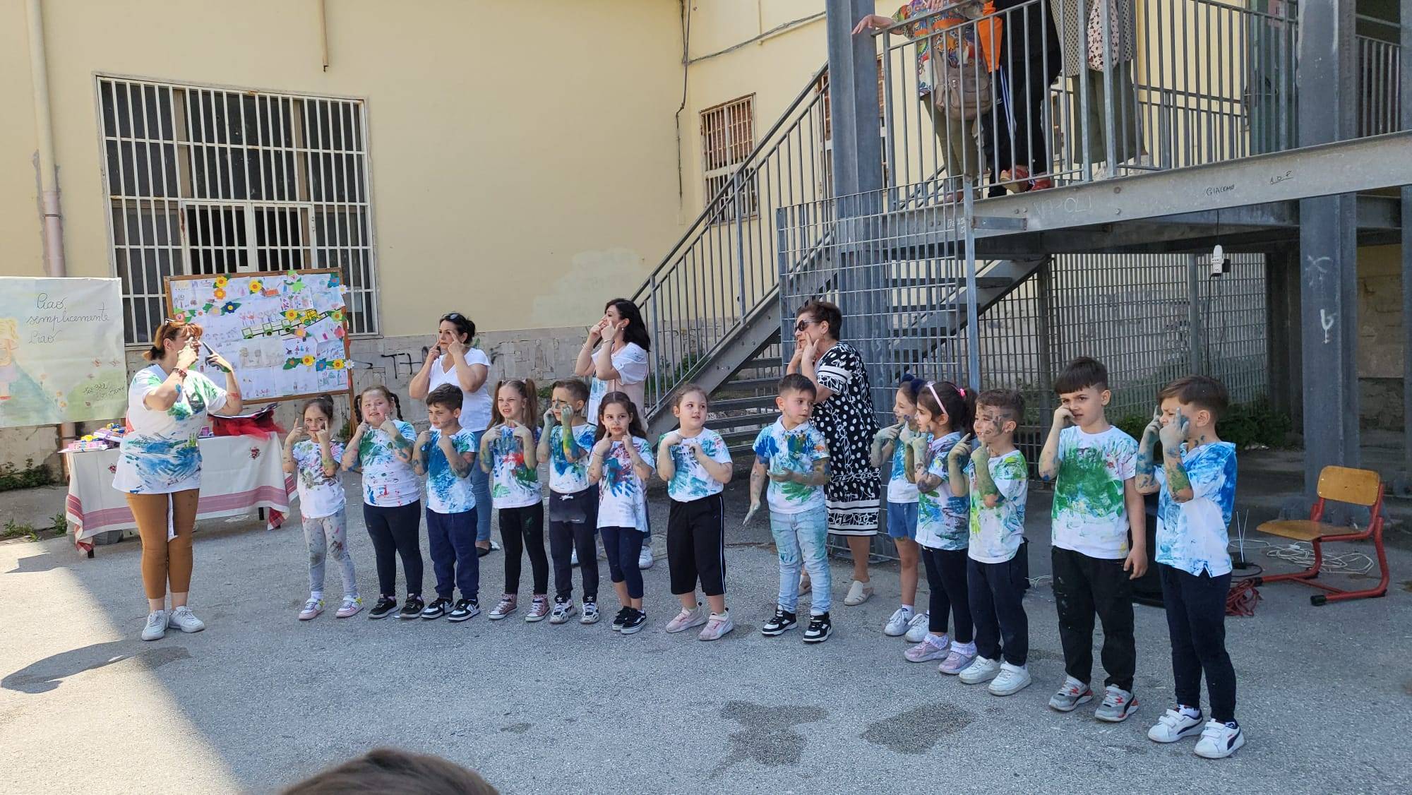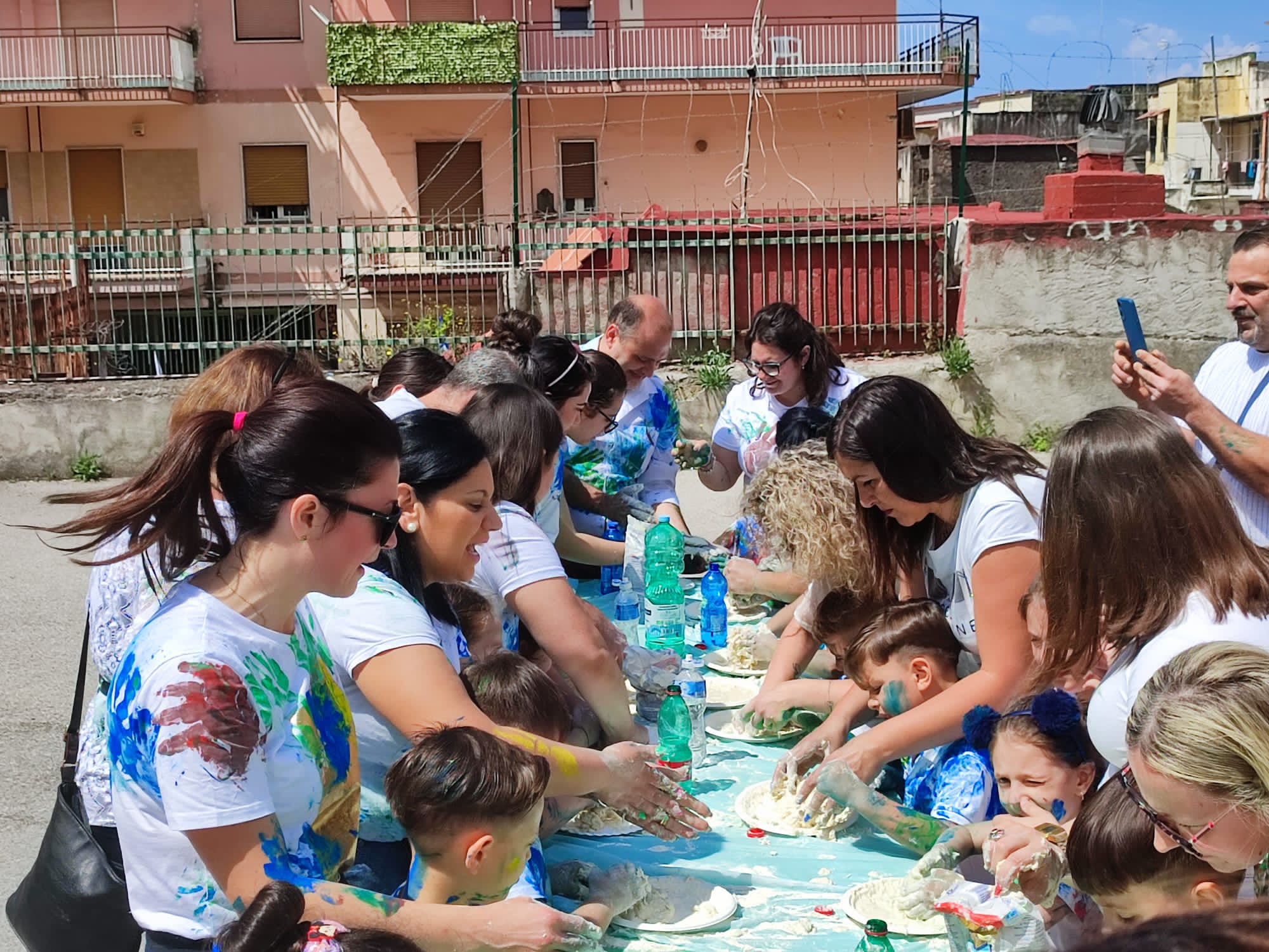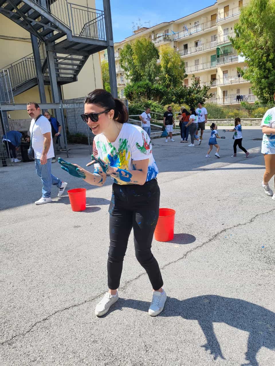 Il primo step è stato un gioco con i colori, dove i bambini e i genitori dipingevano le magliette con le loro impronte.