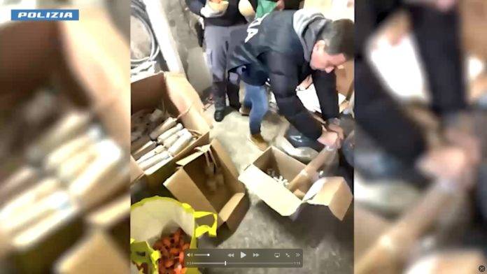 L’intuito investigativo dei poliziotti ha trovato positivo riscontro in quanto, all’interno dello stabile, gli agenti hanno scoperto una vera e propria fabbrica illegale di fuochi pirotecnici; difatti, nel deposito gli operatori hanno rinvenuto e sequestrato diverse batterie di fuochi d’artificio per un peso complessivo di circa 50 kg, 78 razzi, 35 bombe da mortaio, 81 spolette, oltre numerosi petardi artigianali, pezzi di artifizi pirotecnici di fabbricazione artigianale e altro materiale utilizzato per la produzione di fuochi d’artificio privi di etichettatura.