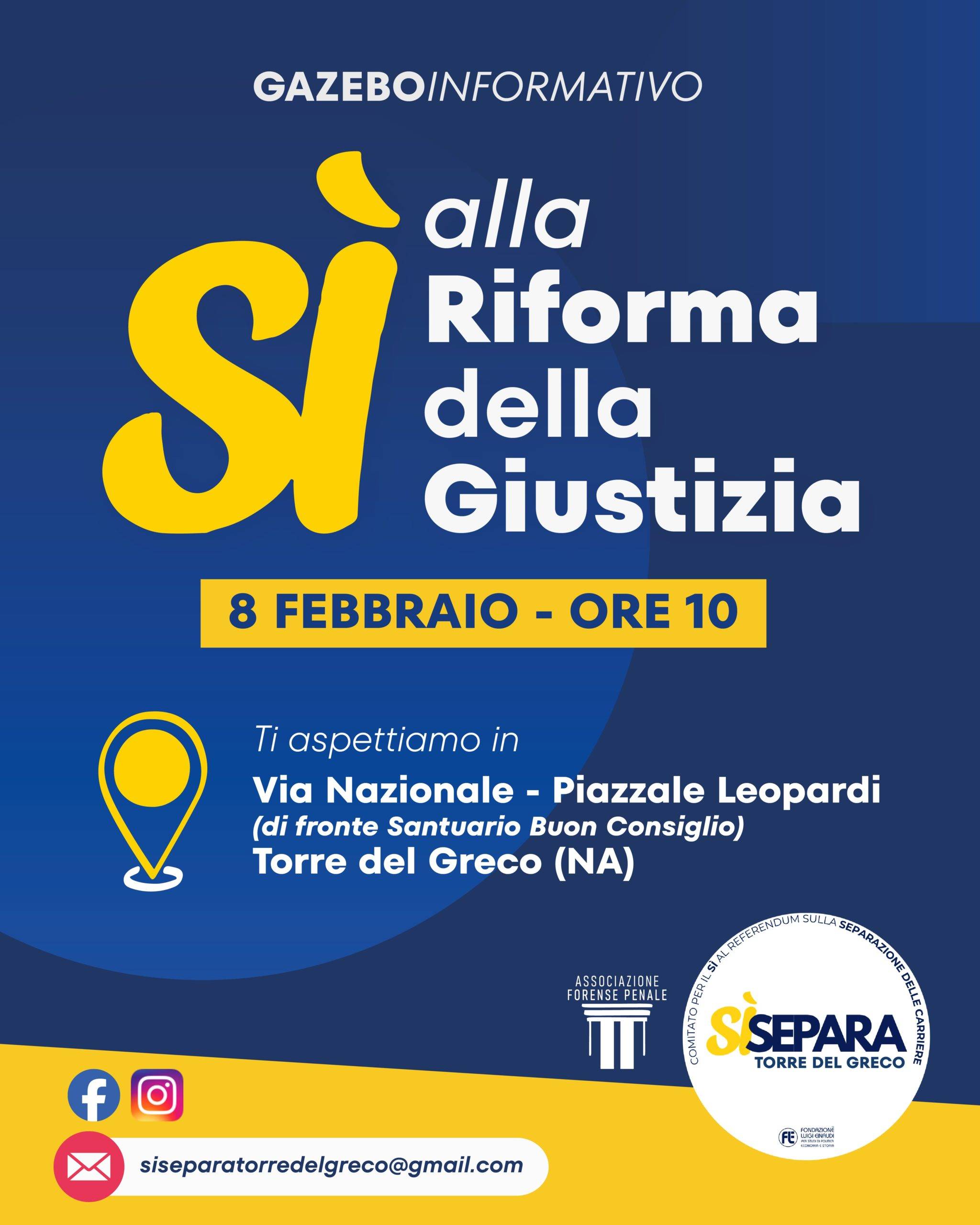 Il Comitato “Sì Separa” di Torre del Greco organizza, per domenica 8 febbraio, dalle ore 10:00 alle ore 13:30, un gazebo informativo nei pressi della Chiesa del Buon Consiglio, con l’obiettivo di incontrare i cittadini e promuovere un confronto aperto e consapevole sul referendum costituzionale sulla giustizia. L’iniziativa, promossa in collaborazione con l’Associazione Forense Penale, nasce dalla volontà di offrire informazioni chiare e accessibili sui contenuti della riforma che propone la separazione delle carriere tra magistratura giudicante e requirente, superando slogan, semplificazioni e letture ideologiche che rischiano di impoverire il dibattito pubblico. Durante la mattinata, i promotori del Comitato saranno a disposizione dei cittadini per spiegare le ragioni del Sì, approfondire i testi della riforma e rispondere a dubbi e domande. L’obiettivo non è convincere con tesi preconfezionate, ma favorire una scelta informata, fondata sui fatti. La separazione delle carriere rappresenta, secondo il Comitato torrese, una riforma di equilibrio: rafforza il principio del giusto processo, tutela l’autonomia della magistratura e interviene sul sistema di autogoverno del CSM per ridurre il peso delle correnti, senza intaccare l’indipendenza dell’ordine giudiziario né subordinare i magistrati alla politica. «Intendiamo portare avanti un percorso di informazione e partecipazione, come testimoniato dalla collaborazione con l’Associazione Forense Penale. Come Comitato per il Sì, rivendichiamo la necessità di riportare il confronto sui contenuti e non su slogan e ideologismi» – sottolineano i fondatori del comitato.