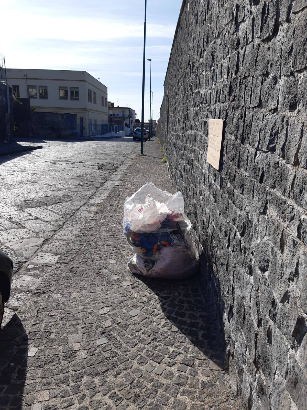 Una busta di indumenti usati, lasciata sul marciapiede come un qualsiasi sacchetto dell’immondizia.