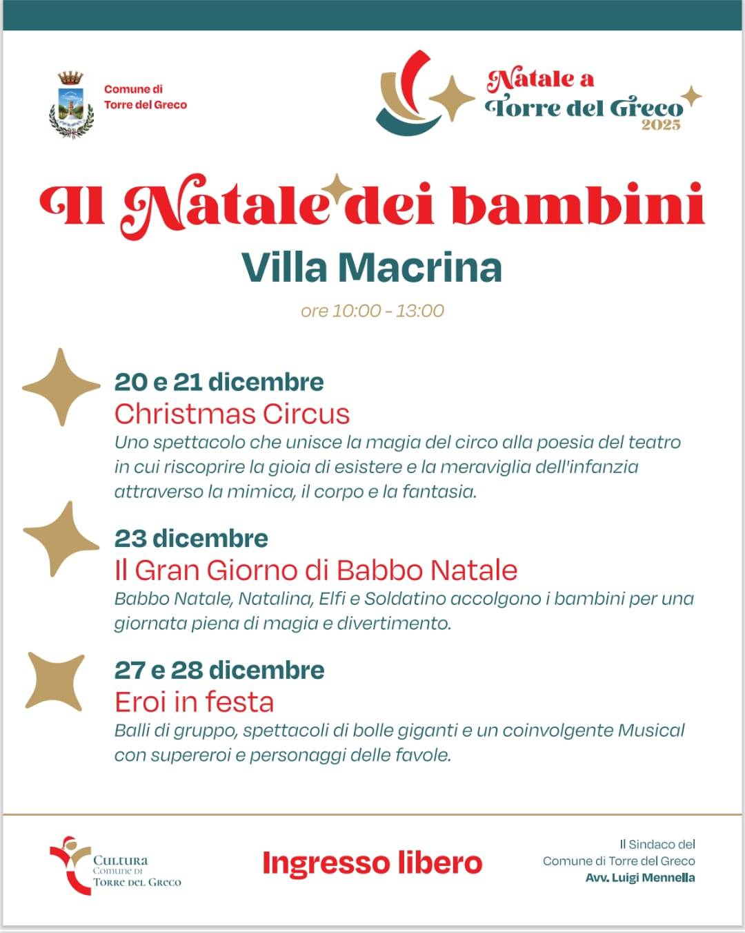 Ingresso gratuito anche nella dimora vesuviana di via Nazionale, dove è in programma “Il Natale dei bambini”, con orario mattutino dalle 10 alle 13. Primo appuntamento sabato 20 e domenica 21 dicembre con “Christmas Circus”, uno spettacolo che unisce la magia del circo alla poesia del teatro, in cui riscoprire la gioia delle feste e la meraviglia dell’infanzia attraverso la mimica, il corpo e la fantasia. Martedì 23 dicembre sarà la volta de “Il gran giorno di Babbo Natale”: oltre a Santa Claus ci saranno Natalina, gli elfi e soldatini che accoglieranno i più piccoli per una giornata fatta di magia e divertimento. Per chiudere “Eroi in festa”, sabato 27 e domenica 28 dicembre: balli di gruppo, spettacoli di bolle giganti e un coinvolgente musical con supereroi e personaggi delle favole.