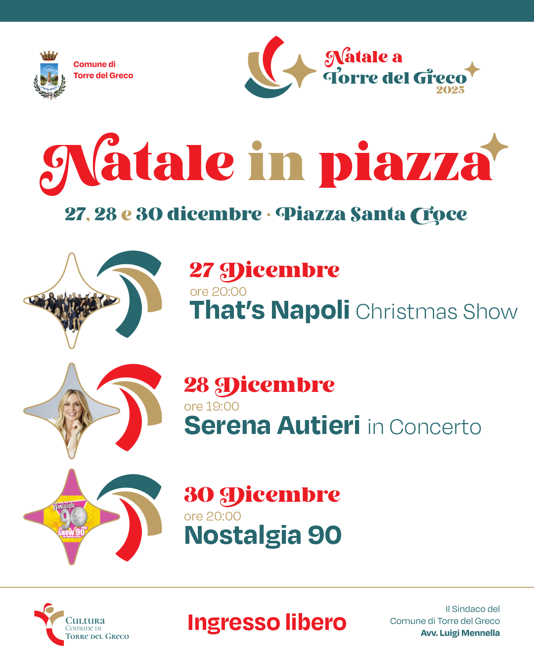 Serena Autieri, That’s Napoli e Nostalgia 90: sono i protagonisti dei tre spettacoli di punta del cartellone di eventi natalizi proposti a Torre del Greco dall’amministrazione comunale nell’ambito delle manifestazioni promosse durante le festività natalizie. Tre serate aperte al pubblico gratuitamente, in programma a piazza Santa Croce, dove verrà montato un palco destinato alle esibizioni previste nel periodo compreso tra Natale e Capodanno, grazie all’impegno profuso dall’ufficio Cultura dell’ente (dirigente Gaetano Camarda).