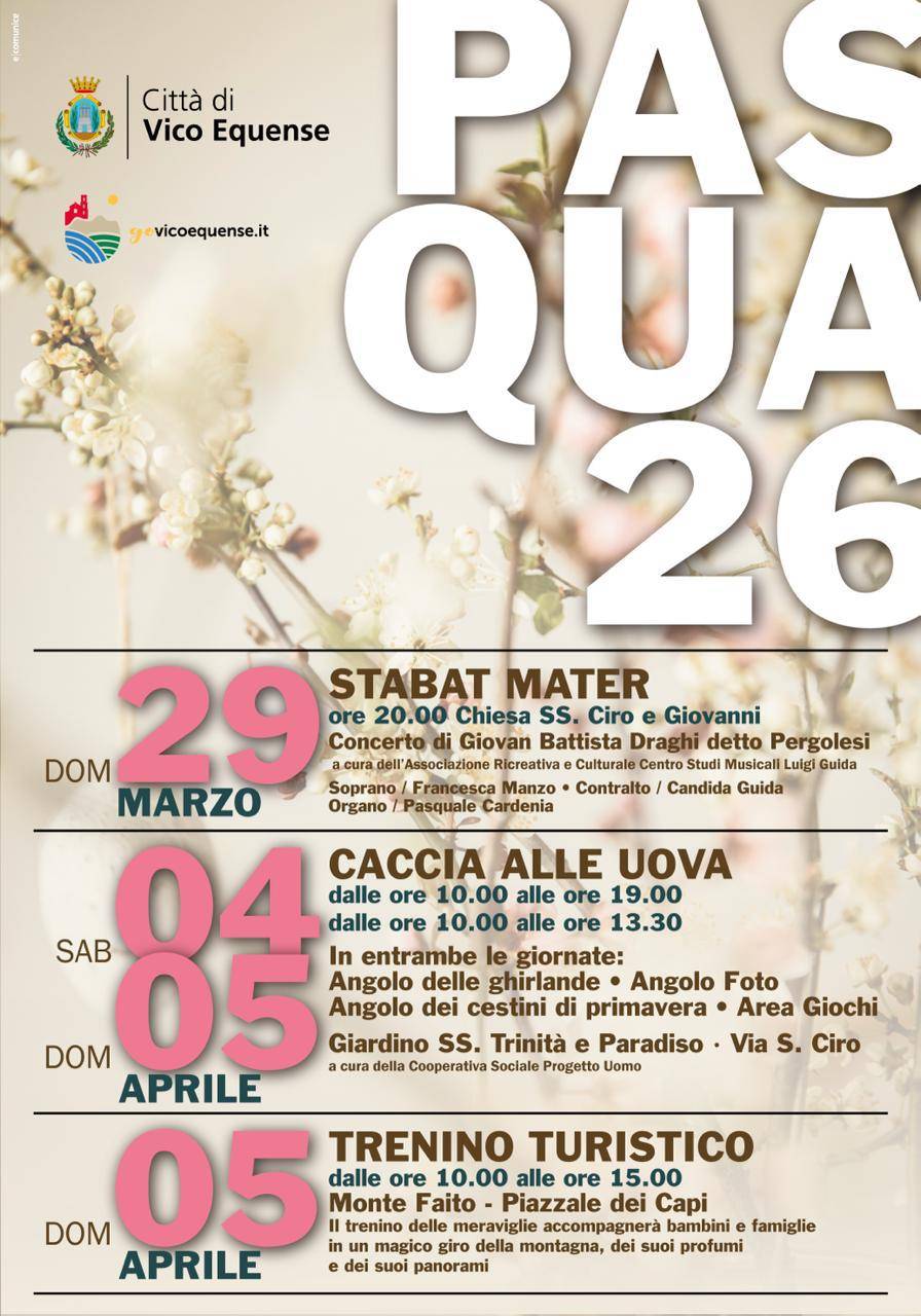 Vico Equense si appresta a vivere le festività pasquali con un programma articolato che coniuga spiritualità, intrattenimento e valorizzazione del territorio. L’amministrazione comunale, capeggiata dal Sindaco Giuseppe Aiello, ha promosso una serie di iniziative pensate per coinvolgere residenti e visitatori, con appuntamenti distribuiti tra fine marzo e i primi giorni di aprile.