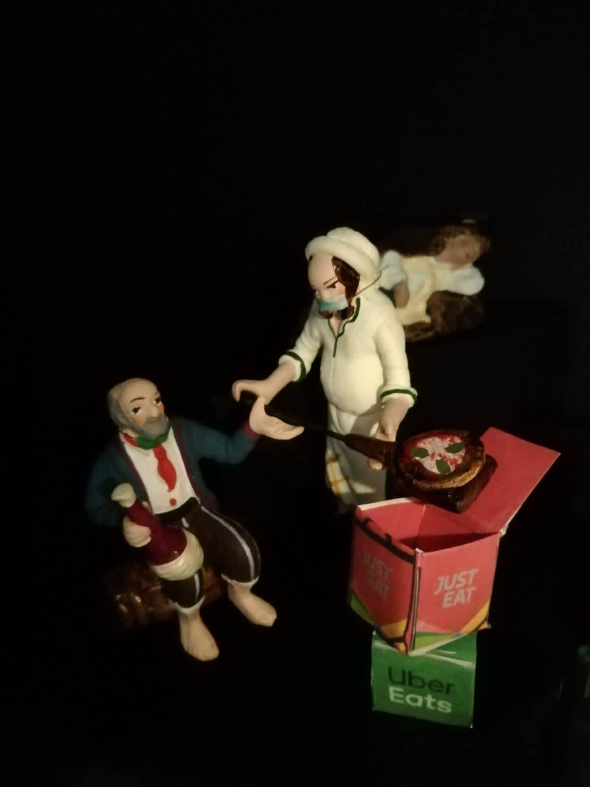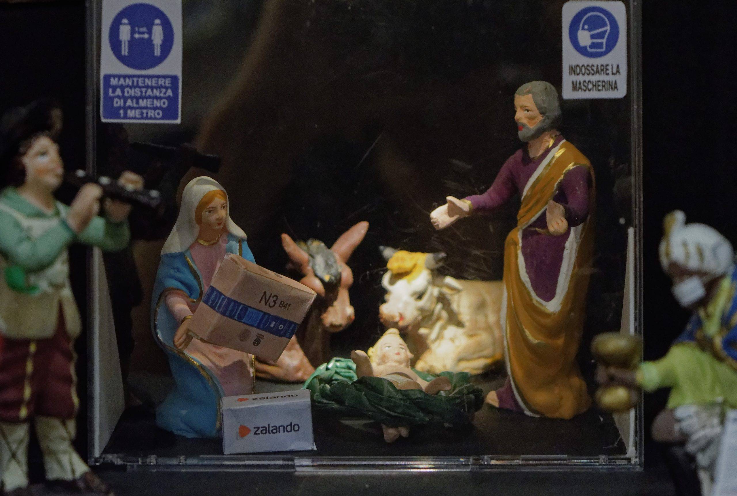 “Anche i pastori nel 2020 dovrebbero portare la mascherina”. Un po’ per tradizione e un po’ per gioco i napoletani Carolina Ciuccio, artista, e Giuseppe Mattiucci, avvocato, hanno realizzato nella loro casa/studio in via Tribunali un presepe ai tempi del Covid-19. Una scenografia minimale, quasi teatrale, fa da sfondo neutro per una natività contemporanea. Nel presepe, insieme alle tradizionali “figurelle” del ‘700 napoletano, sono presenti alcuni elementi del nostro quotidiano come il totem per l’Amuchina, il Napisan per disinfettare, i pacchi spediti da Amazon e Zalando al posto dei tradizionali doni, le pizze a domicilio con Just Eat e Uber Eats, l’autodichiarazione che i Re Magi esibiscono per giustificare la loro presenza fuori regione, il pannello in plexiglass a protezione della natività con tanto di cartelli di obbligo di distanziamento sociale e uso della mascherina, indossata dai pastori sul viso. Ma anche, come siamo abituati a vedere in giro, sotto mento o gomito. “Il nostro presepe ai tempi del Coronavirus non vuole essere né blasfemo né catastrofico, ma semplicemente rappresentare un simbolo della tradizione in maniera attuale – racconta la coppia -. Lo abbiamo pensato e costruito calandolo nella realtà che viviamo, piena di contraddizioni e novità con le quali ogni giorno – che ci piaccia o no – dobbiamo rapportarci”.