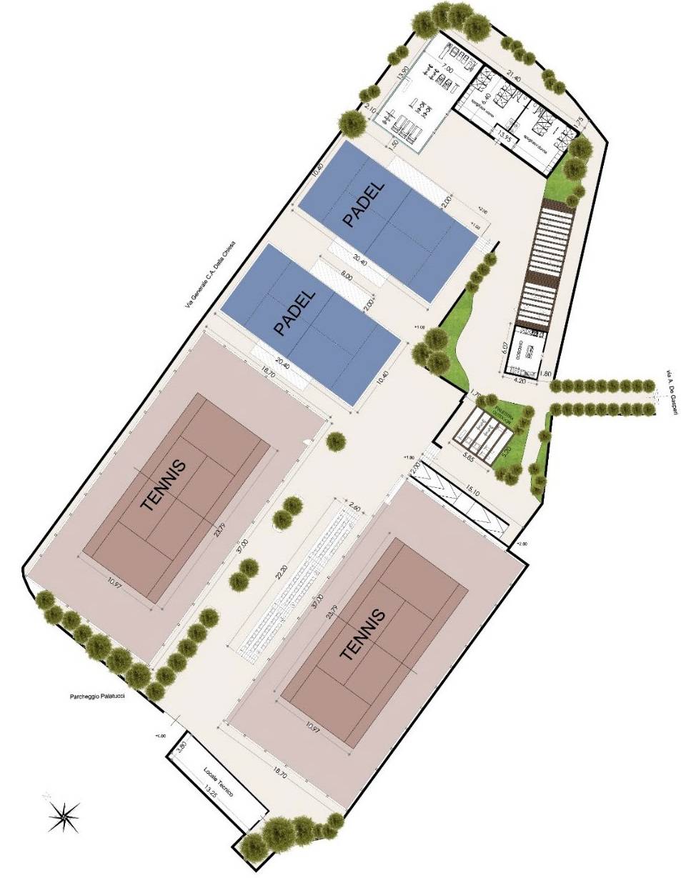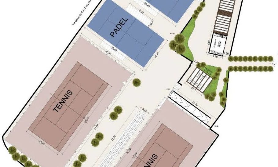 Stando a quando presente nella relazione tecnica che accompagna l’atto licenziato dall’esecutivo, l’ipotesi progettuale si base sulla riorganizzazione complessiva dell’impianto, che punta alla valorizzazione dell’articolazione altimetrica esistente e sulla separazione funzionale tra aree sportive e aree di servizio. L’intera struttura sarà caratterizzata da due livelli sfalsati tra loro di circa 1,2 metri: la parte inferiore verrà integralmente destinata all’attività sportiva, con la riqualificazione di due campi di tennis già esistenti e la realizzazione di due campi da padel in sostituzione del campo polivalente dismesso.