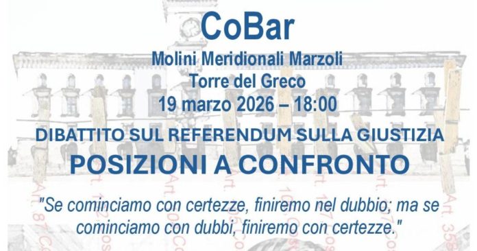 Si terrà domani pomeriggio, alle ore 18.00, al Co.Bar dei locali Stecca – presso la sede degli Ex Molini Meridionali Marzoli, a Torre del Greco – un dibattito sul Referendum sulla Giustizia che si voterà il 22 e 23 Marzo prossimo.
