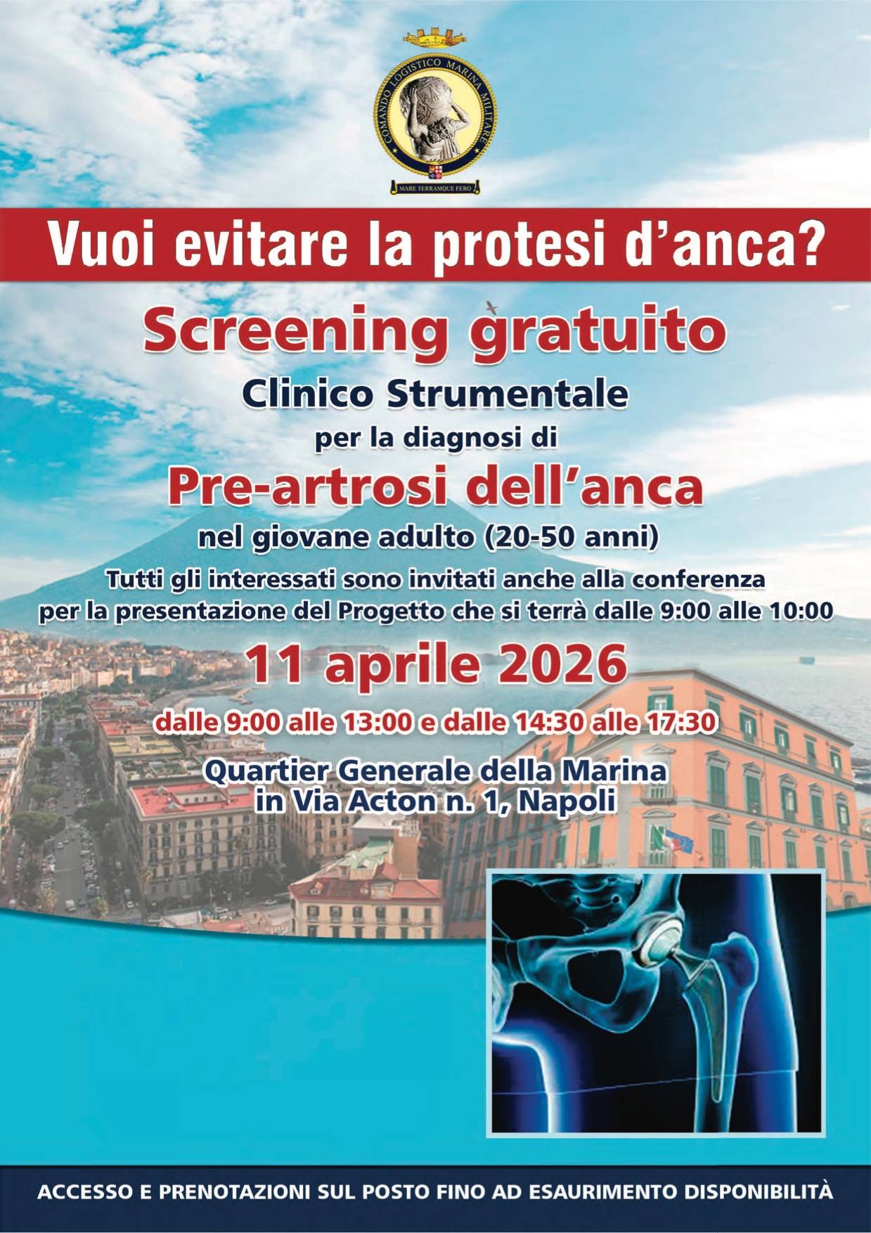 In occasione delle iniziative legate alla Giornata del Mare, la Marina Militare promuove a Napoli una giornata dedicata alla prevenzione sanitaria, offrendo alla cittadinanza uno screening clinico-strumentale gratuito per la diagnosi della pre-artrosi dell’anca.