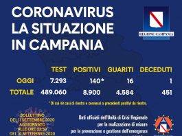 Bollettino coronavirus in Campania: oggi 140 positivi su 7.293 tamponi