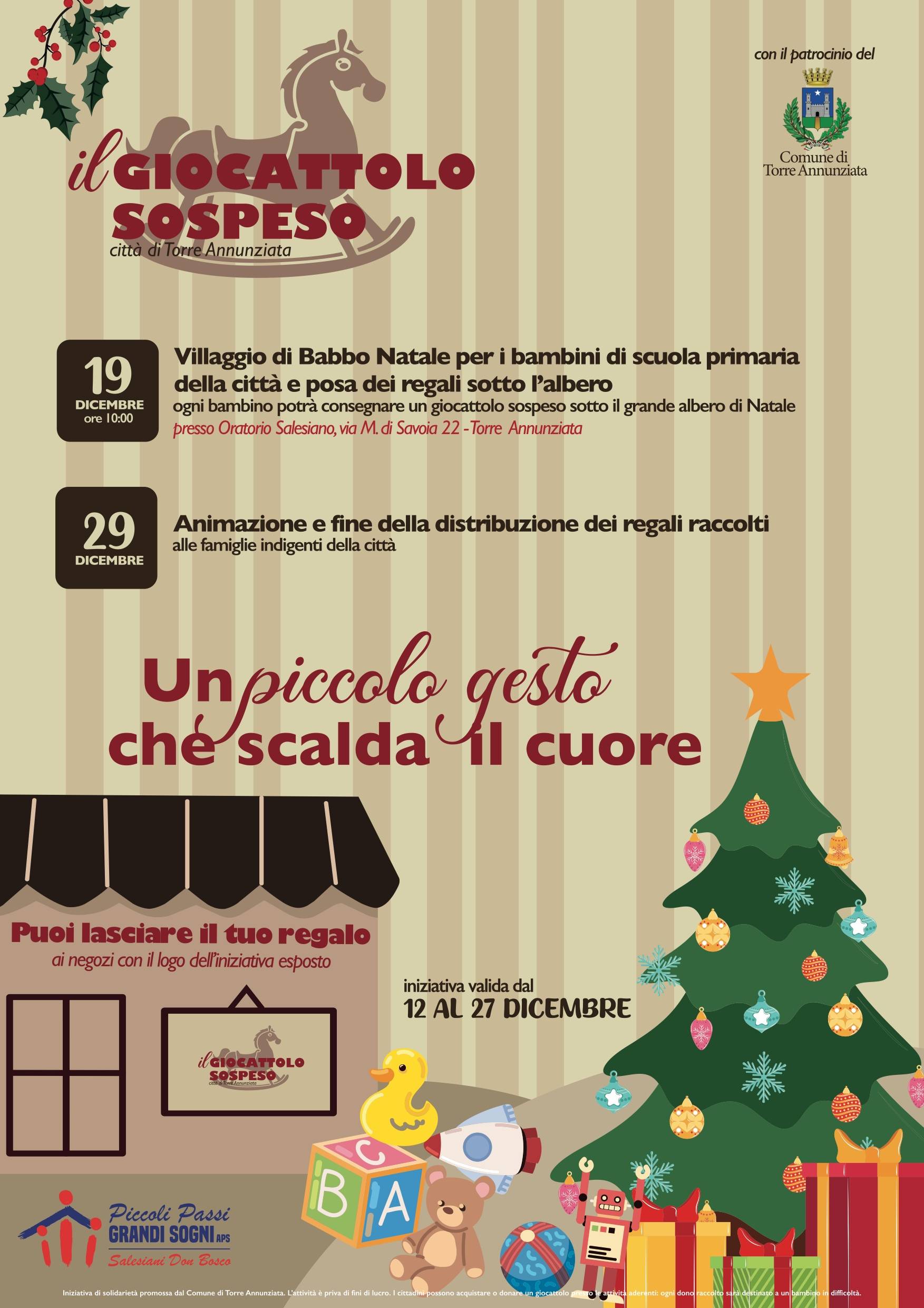 Il Comune di Torre Annunziata ha approvato la delibera che istituisce il “giocattolo sospeso”. Obiettivo dell’iniziativa, voluta dall’Amministrazione Comunale, è garantire a tutti i bambini un dono in vista del Natale. Il progetto punta a coinvolgere i cittadini che potranno lasciare in questo modo, presso i negozi aderenti, un gioco “sospeso”. I volontari dei Salesiani provvederanno poi a ritirare tutti i giochi donati dai cittadini per poi consegnarli ai bimbi nel corso di una manifestazione. Da oggi, 13 dicembre e fino al 27, sarà possibile acquistare un gioco che sarà poi ritirato dai volontari.