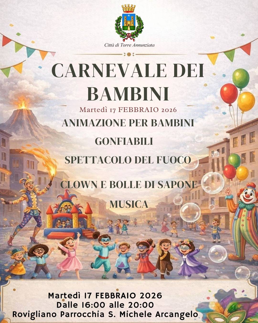 Due appuntamenti a Torre Annunziata in occasione del Carnevale 2026. In occasione del martedì grasso l’Amministrazione Comunale ha organizzato due diversi momenti per i bambini e le famiglie. Domenica 15 febbraio in villa Parnaso si terrà il Villaggio dei dinosauri. Dalle 10.00 alle 13.00 ci sarà animazione per i bambini, laboratori creativi, baby dance, giochi gonfiabili e attrazioni a tema dinosauri.