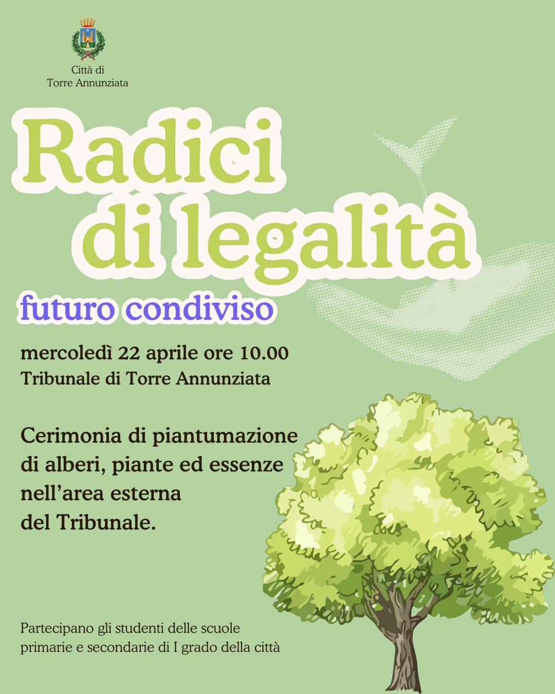 Si terrà mercoledì 22 aprile alle ore 10.00 nel piazzale esterno del Tribunale l’iniziativa “Radici di legalità, futuro condiviso”, promossa dal Comune di Torre Annunziata in collaborazione con il Tribunale di Torre Annunziata.