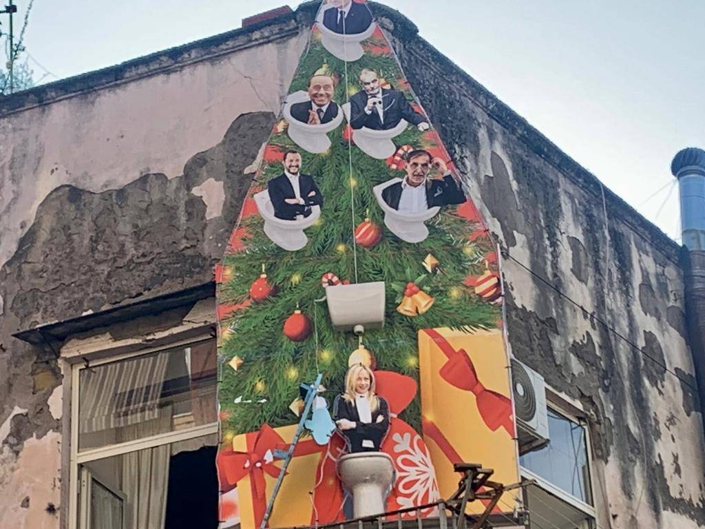 L’installazione era apparsa sulla facciata di un palazzo in via Fontana, ormai come ogni anno da tradizione.